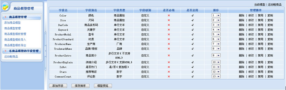 這里主要是定義商品模型的名稱、數據表名、商品性質等內容。添加完商品模型后,我們需要為模型設計字段,也就是我們常見的為該商品模型的數據庫表設計字段:商店管理——商店設置——商品模型管理——各商品模型的字段管理。