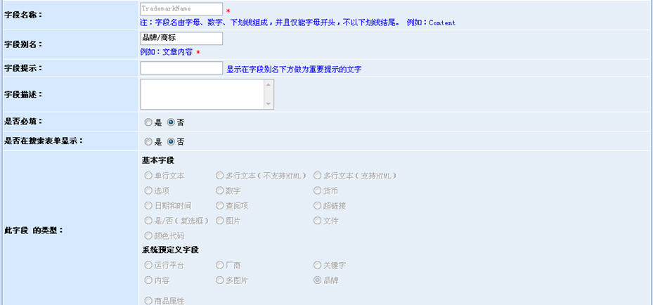 這里有字段名稱、提示、是否必填、字段類型等內容需要我們進行定義。動易eShop2007將商品的數據庫表的修改權限完全開放了出來,以實現(xiàn)最大程度的用戶自定義,滿足不同的網店商品的需求。特別地,我們看到字段類型有一些“奇怪”的名詞,如:多行文本(支持HTML)、顏色代碼、圖片、超鏈接、文件等。這些并不是數據庫字段的類型,而是eShop2007內置好的一些功能,用于在商品模型里自定義使用HTML編輯器、顏色代碼選擇器、圖片上傳、文件上傳等。也就是說,動易eShop把諸多以前固定的封裝的功能都開發(fā)出來了,實現(xiàn)了這些功能調用的自定義,極大地賦予了系統(tǒng)的自由性。