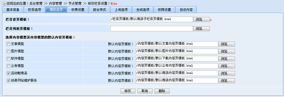 當添加完商品模型后,我們還需要為商品添加分類欄目,并指定欄目的商品模型(一定要指定欄目的商品模型,否將不能在該欄目添加商品,一個欄目可以指定多個商品模型)。
