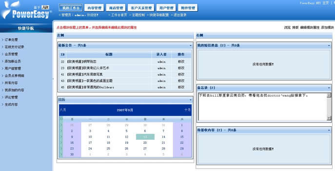 “我的工作臺”采用.Net2.0的WebPart組件來進行開發(fā)的,整個操作界面包含三個部分:工作臺導航條、左側(cè)快捷導航、右側(cè)內(nèi)容顯示。通過對三個部分的設置,管理員登陸后臺便可以清楚的知道待審文章數(shù)量、訂單數(shù)量、付款金額、最近聯(lián)系客戶、發(fā)貨訂單數(shù)、日程等各種日常需要處理的信息。特別是能夠在“我的工作臺”中直接處理如回復短消息、添加日程、處理訂單、審核文章等相關(guān)信息。