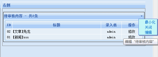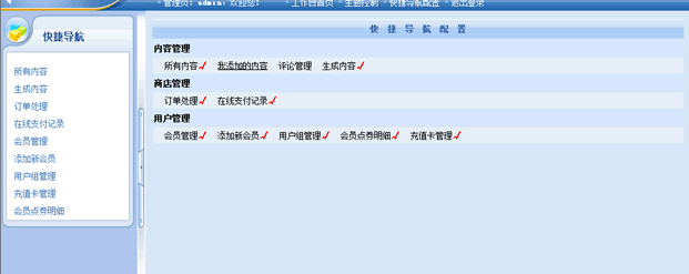 2、可以對左側(cè)快捷導航中的管理項目進行預設,由于采用了ajax技術(shù),在右側(cè)點擊某項內(nèi)容后,左側(cè)的導航將隨著自動增加和減少相應管理項目。