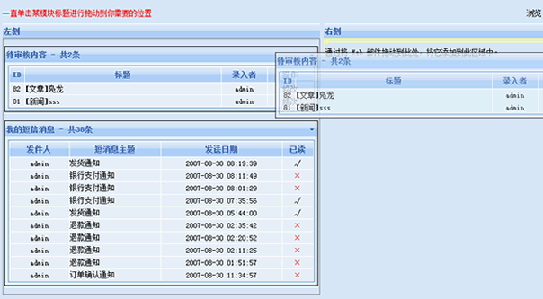 3、整個“我的工作臺”首頁采用了流行的拖拽效果和ajax效果處理,通過拖拽、移動可以對頁面的內(nèi)容與布局進行編輯。