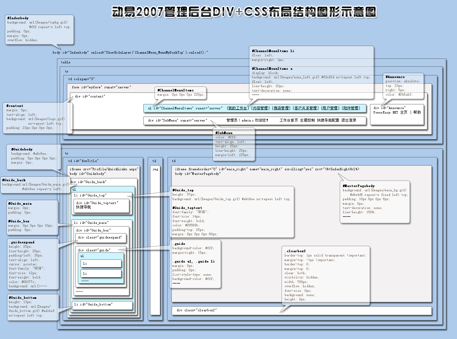 如果要完全修改管理后臺的布局與樣式,則需要修改到上述相關(guān)文件。.aspx和.css文件相配合,控制后臺頁面結(jié)構(gòu)與樣式,在了解管理后臺設(shè)計前,請先仔細(xì)閱讀并理解管理后臺的結(jié)構(gòu)圖形示意圖:
