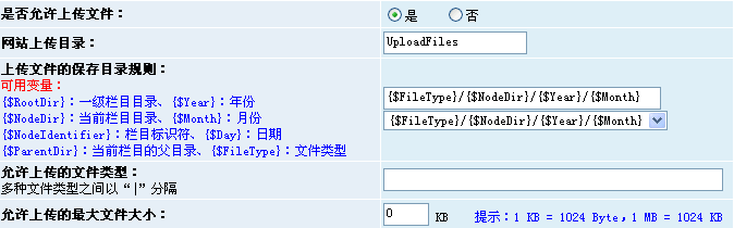 從圖中可以看出,除了上傳文件管理能夠?qū)Ρ4娴奈募M行分類外,還能夠控制上傳功能開關、上傳文件類型和文件大小。另外,上傳文件管理功能配合系統(tǒng)內(nèi)置的上傳文件過濾功能,可謂是對上傳了進行了全方位的管理了。