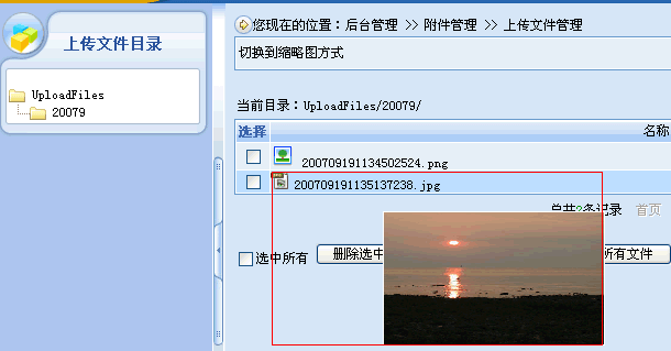 最后,CMS2007的上傳文件功能除了能更加方便地進行文件的管理外,還支持在網(wǎng)站后臺直接對附件進行刪除、上傳等操作,當然,對于圖片類型的附件的系統(tǒng)提供的查看方式也是可視化的(下圖紅色方框是鼠標移動到附件文件名上時,會即時出現(xiàn)該文件的縮略圖)。