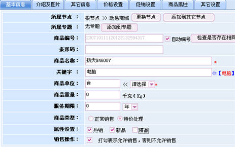 在動(dòng)易eShop2007前臺(tái)商城里分別有五個(gè)商品欄目,代表五種銷(xiāo)售狀態(tài)的商品:最新商品、推薦商品、熱賣(mài)商品、精品商品、固頂商品。其中最新商品、熱賣(mài)商品和精品商品這三種可以通過(guò)后臺(tái)“添加商品——基本信息——商品屬性設(shè)置”來(lái)設(shè)置。后臺(tái)商品的設(shè)置有三個(gè)選擇:熱銷(xiāo)、新品和精品,分別對(duì)應(yīng)前臺(tái)的熱賣(mài)商品、最新商品和精品商品。添加商品時(shí)勾選了哪個(gè)商品屬性,該商品就將自動(dòng)在前臺(tái)對(duì)應(yīng)的商品欄目中顯示。