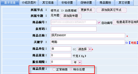 另外,除了這五種銷(xiāo)售狀態(tài)外,動(dòng)易eShop2007還可以設(shè)置正常銷(xiāo)售和特價(jià)商品和這兩種銷(xiāo)售狀態(tài),這是從價(jià)格管理上來(lái)區(qū)分的。這個(gè)可以在后臺(tái)“添加商品——基本信息——商品類(lèi)型”中進(jìn)行勾選,