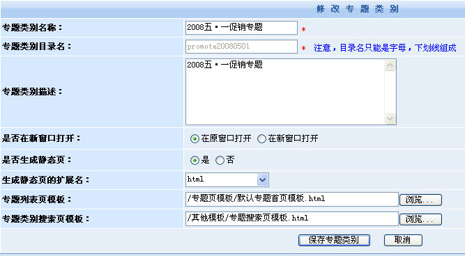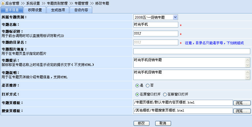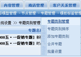 1、添加專題\專題類別與專題類別管理:進(jìn)行專題和專題類別的添加、修改設(shè)置、刪除。用戶可根據(jù)實際的業(yè)務(wù)需要設(shè)置各種專題類別與專題,如:文章專題、商品專題、圖片專題,又或者是5·1促銷專題、2·14情人節(jié)專題、PhotoShop教學(xué)專題等。要注意的是,專題類別是不能包含內(nèi)容的。