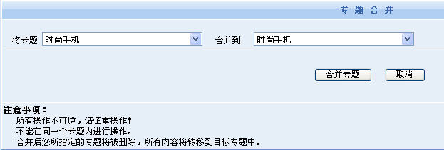 3、合并專題:進(jìn)行專題的合并。一般情況下我們不會需要使用專題合并功能。專題合并的操作是將兩個專題的內(nèi)容(文章、圖片、商品等)合并到一個專題中去,若出現(xiàn)相同的內(nèi)容則自動忽略。