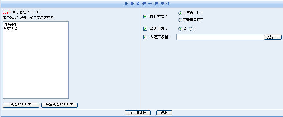 4、批量設(shè)置:這是為簡化操作而設(shè)計的功能,當(dāng)需要設(shè)置的專題數(shù)量很大的時候,一個個地設(shè)置專題就變得非常麻煩,使用批量設(shè)置則可一次性對N個專題進(jìn)行設(shè)置。
