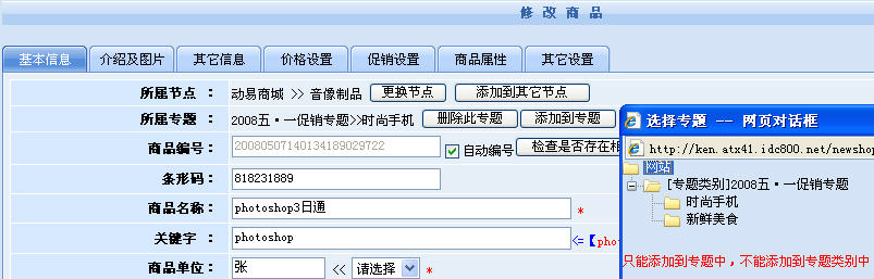 5、將內(nèi)容歸屬于專題:專題類別與專題都設(shè)置好了之后,我們需要做的就是將網(wǎng)站里的內(nèi)容分別設(shè)置到相應(yīng)的專題中去。通過后臺編輯商品或者編輯文章、圖片等,我們可以為每一個商品、文檔設(shè)置相應(yīng)的歸屬專題,并讓這些內(nèi)容在相應(yīng)的專題頁面展現(xiàn)出來。