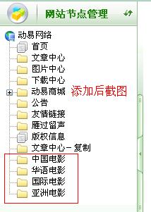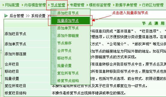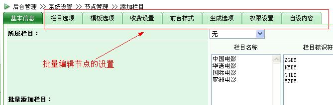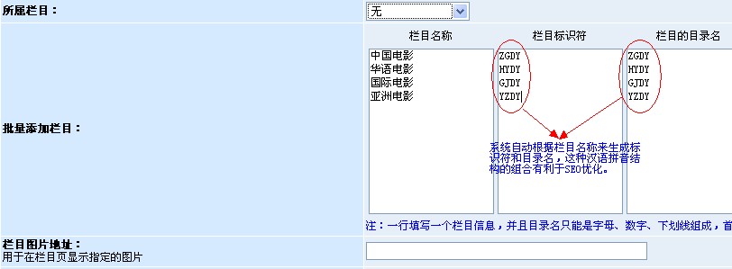 點(diǎn)擊“批量添加節(jié)點(diǎn)”后進(jìn)入“節(jié)點(diǎn)批量增加”界面,每行為一個(gè)節(jié)點(diǎn)(如圖中所示:中國(guó)電影為一個(gè)節(jié)點(diǎn)、話語(yǔ)電影為一個(gè)節(jié)點(diǎn)…),值得一提的是,系統(tǒng)會(huì)自動(dòng)根據(jù)欄目名稱來(lái)生成標(biāo)識(shí)符和目錄名,這種漢語(yǔ)拼音結(jié)構(gòu)的組合形式有利于站點(diǎn)的SEO優(yōu)化: