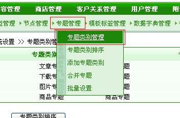 首先我們通過(guò)頂部導(dǎo)航,進(jìn)入“系統(tǒng)設(shè)置”——“專題管理”并點(diǎn)擊進(jìn)入“專題類別管理”: