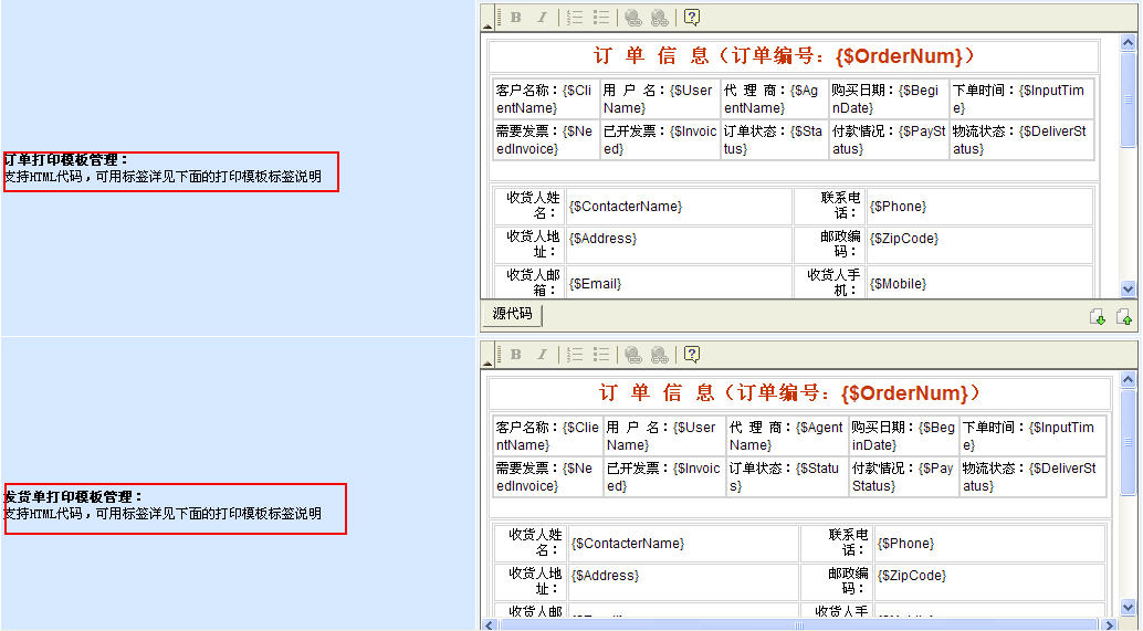 在網(wǎng)站后臺(tái)的商店模板配置里,我們能夠根據(jù)自己業(yè)務(wù)實(shí)際情況來(lái)設(shè)計(jì)相應(yīng)的訂單與發(fā)貨單的打印模板。設(shè)計(jì)方式非常簡(jiǎn)單,支持可視化編輯,建立相應(yīng)的表格后在需要的位置里加入相應(yīng)的標(biāo)簽即可。簡(jiǎn)單的是最好的,不是嗎?:)因?yàn)橹С謍tml代碼,你還可以發(fā)揮自己在網(wǎng)頁(yè)技術(shù)的特長(zhǎng),把公司logo等內(nèi)容加到相應(yīng)的位置,設(shè)計(jì)出非常正規(guī)的訂單或發(fā)貨單。