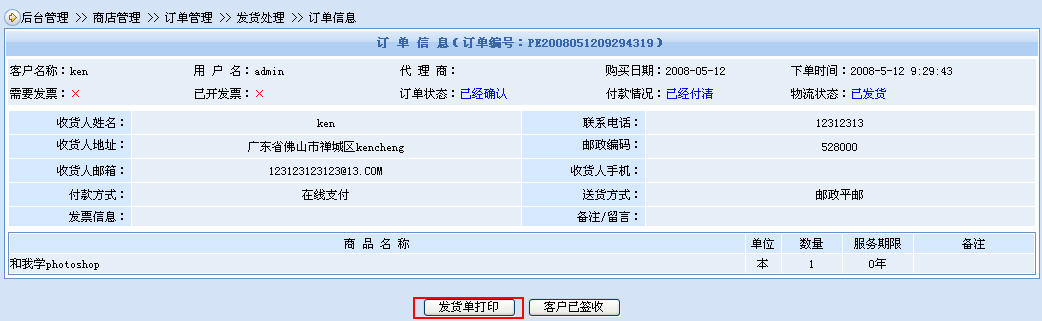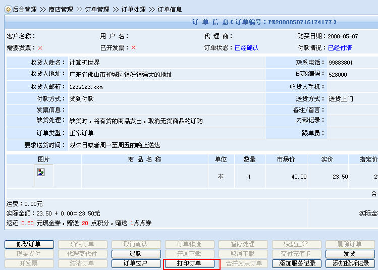 動(dòng)易SF eShop的單據(jù)打印是和處理流程緊密結(jié)合的。訂單打印在訂單處理環(huán)節(jié)里,發(fā)貨單打印在發(fā)貨處理環(huán)節(jié)里,合理方便。當(dāng)然,如果再增加一個(gè)單獨(dú)的單據(jù)打印功能可能也不錯(cuò),當(dāng)我們批量要打印單據(jù)的時(shí)候能很快打印出來(lái)。