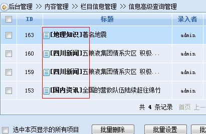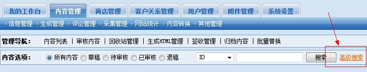 通過內(nèi)容管理的信息管理進入到信息管理界面,在常規(guī)操作菜單我們能夠看到“高級搜索”的按鈕,點擊即可進入到新功能的操作界面: