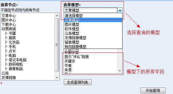 第三步:選擇模型后系統(tǒng)會自動列出該模型下所有的字段,包括自定義字段。選擇我們需要查詢的項目,這里選擇“關鍵字”和“文章內(nèi)容”進行搜索,并填寫好查詢的內(nèi)容。