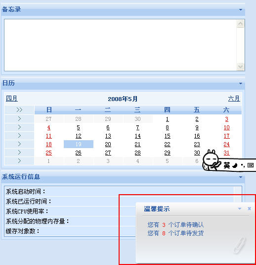 同時,在SF CMS/eShop 1.1里,冒泡信息提示是根據(jù)管理員權限進行判斷的。只有擁有相應管理權限的用戶登錄后臺才將收到相應的提示內(nèi)容。而在后面,我們還將對這項功能進行進一步的擴展,包括有:后臺對顯示項進行配置、后臺增加一些Tips顯示項,如有未讀接收短信等,在前臺會員中心增加冒泡提示等……一如既往,歡迎大家提出更多的功能改善建議!