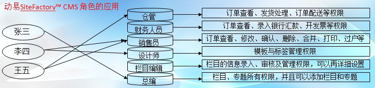 動易SiteFactory? CMS的角色是通過標準RBAC(基于角色的訪問控制)模型實現(xiàn)的,下圖為SiteFactory? CMS中角色應(yīng)用舉例示意圖。我們建立了“倉管”、“財務(wù)人員”、“銷售員”、“設(shè)計師”、“欄目編輯”、“總編”等角色,并且它們都具有相對獨立的控制權(quán)限。將張三、李四、王五賦予不同的角色后,他們就擁有了一系列權(quán)限。從圖中看出用戶與角色是多對多的關(guān)系。即一個用戶可以屬于多個角色之中,一個角色可以包括多個用戶。