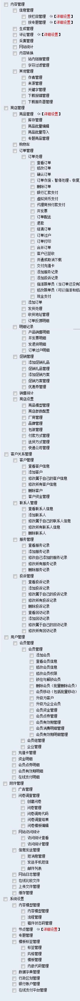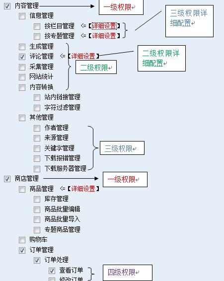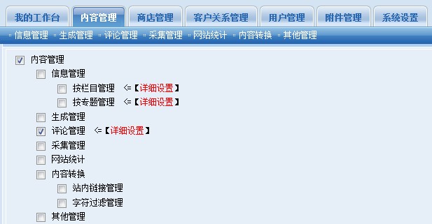 此外,樹狀目錄中的權(quán)限還配備了“詳細(xì)配置”的功能,為角色分配權(quán)限提供了更多種的配置途徑。下一節(jié)我們將以“信息管理”子模塊下的“按欄目管理”三級權(quán)限的詳細(xì)設(shè)置來進行介紹節(jié)點的權(quán)限設(shè)置。