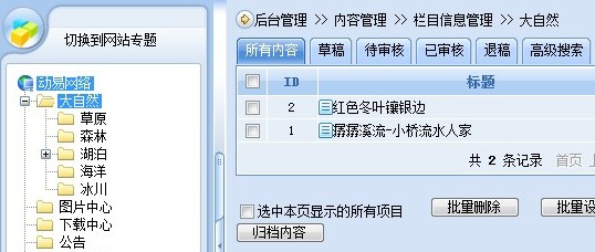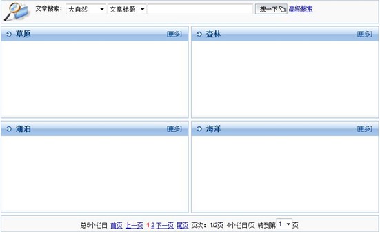 最后,瀏覽前臺可以看到,雖然沒有設(shè)置“欄目首頁模板”,但“大自然”欄目依然分頁顯示出了其子欄目,如下圖所示: