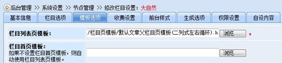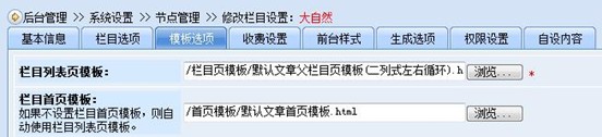 c、“大自然”節(jié)點的模板選項設(shè)置了“欄目列表頁模板”、“欄目首頁模板”及“內(nèi)容頁模板”。