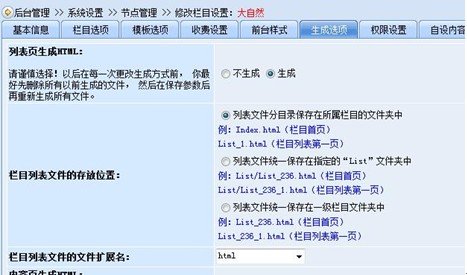 其次,“生成選項”設(shè)置如下圖所示,生成欄目列表頁。