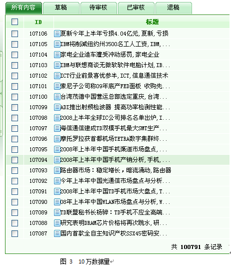 動易SiteFactory的前臺是否可以承載100萬數(shù)據(jù)量,要看模板和標(biāo)簽的合理設(shè)計(jì)、數(shù)據(jù)庫對應(yīng)的優(yōu)化。不過從測試來看,官方提供的模板和標(biāo)簽還是比較合理的,能夠輕松承載100萬的數(shù)據(jù)量。