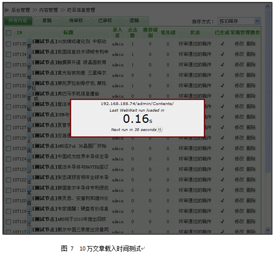 為了不讓ASP.NET的特性影響生成速度,先生成某個只有10篇文章的欄目列表,再生成此欄目的列表并計(jì)時。