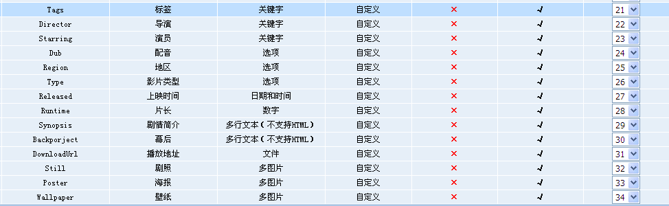 在視頻模型中,新增的自定義字段多達(dá)十幾個,包括:標(biāo)簽、演員、導(dǎo)演、配音、地區(qū)、影片類型、上映時間、片長、劇情介紹、幕后、播放地址、劇照、海報、壁紙等等,基本可以滿足站長對構(gòu)建視頻模塊的常見需求,另外站長還可自行新增字段或者對已有字段進(jìn)行修改,以滿足自己的更多個性化需求。