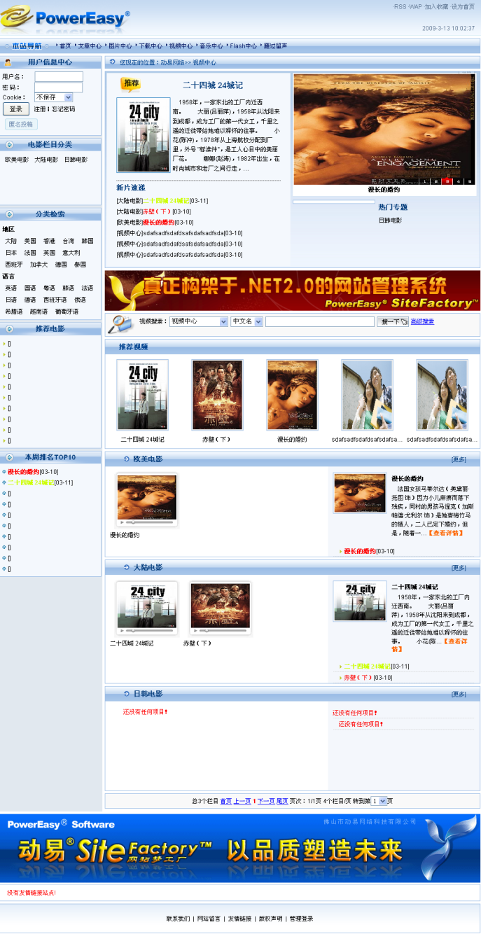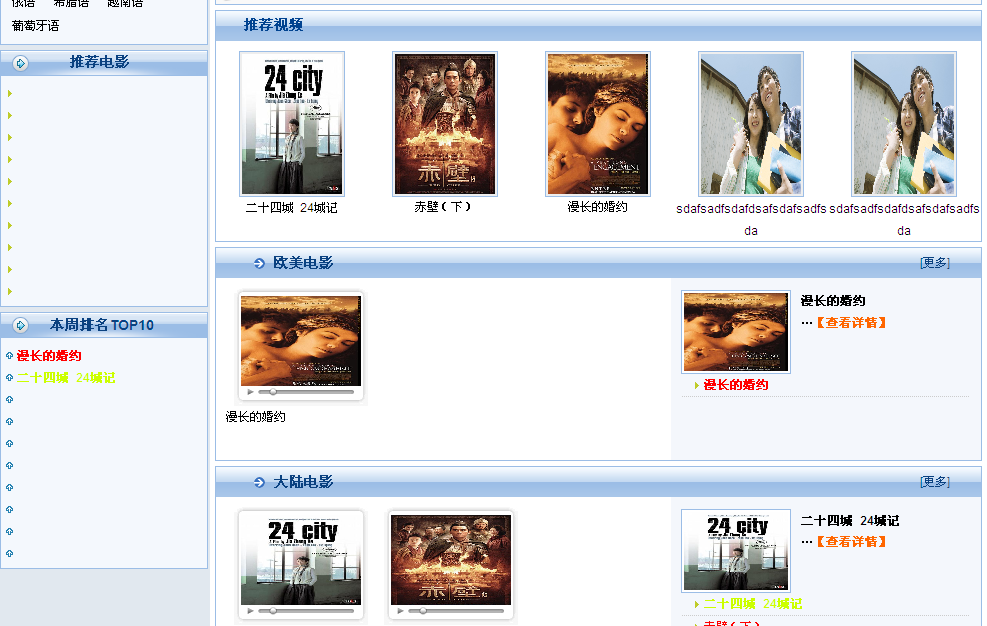 而在視頻模型專門配置的前臺頁面模板中,還內(nèi)置了一系列的標(biāo)簽,如分類檢索、推薦電影、本周排名、新片速遞、推薦視頻、最新影評等等,前臺用戶可以在線觀看視頻、可以按標(biāo)簽、演員、導(dǎo)演、配音、地區(qū)、影片類型、上映時間、片長、劇情介紹、幕后等字段對站內(nèi)視頻進(jìn)行搜索,可以對視頻發(fā)表評論,還可以查看到各種視頻排行榜單。