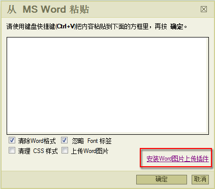 二、在出現(xiàn)的“從 MS Word 粘貼”彈出窗口中點(diǎn)擊“安裝 Word 圖片上傳插件”下載插件并安裝在本機(jī)(在使用這個(gè)功能之前,我們得在本機(jī)或是客戶端電腦上先安裝這個(gè)插件)。
