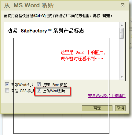 三、插件安裝成功后,在“從 MS Word 粘貼”彈出窗口中,將 Word 中的內(nèi)容復(fù)制并粘貼(Ctrl+V)到窗口中(當(dāng)然 Word 中的內(nèi)容應(yīng)該有圖片哩^_^)。要注意勾選窗口中的“上傳 Word 圖片”選項(xiàng):