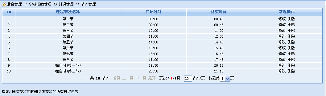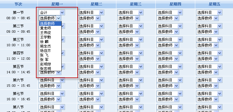 可對(duì)學(xué)校所有班級(jí)的每周課程進(jìn)行預(yù)先排課,包括課程節(jié)次、上課時(shí)間、科目、任課教師等;此外,還可預(yù)先排列多個(gè)學(xué)期的課程表,如每學(xué)期末預(yù)先排列下學(xué)期的課程表等。
