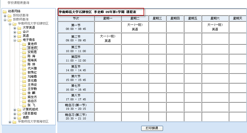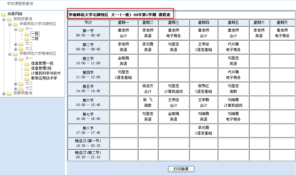 學(xué)生和教師可在前臺(tái)快速查詢到所有班級(jí)的課程表,系統(tǒng)提供了按班級(jí)查詢和按教師查詢兩種查詢方式,以方便不同身份的用戶查詢。如學(xué)校領(lǐng)導(dǎo)和年級(jí)領(lǐng)導(dǎo)可查看所有班級(jí)的課程表,任課教師可查詢自己的任課課程表,而學(xué)生則可查詢自己班級(jí)的課程表。