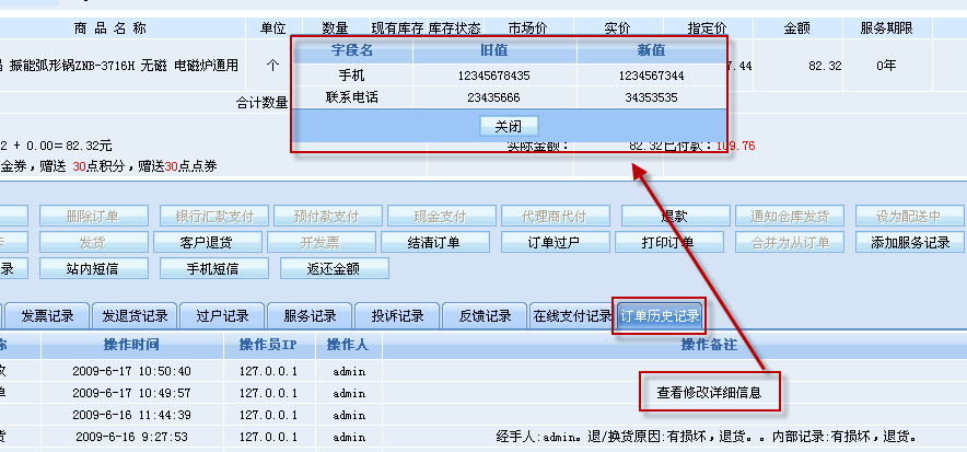在BizIdea? 2.5版本里,我們?cè)黾恿擞唵螝v史記錄的功能,對(duì)于管理員對(duì)于單個(gè)訂單的每一步操作,系統(tǒng)都將把操作步驟、操作人、操作時(shí)間、操作員IP等詳細(xì)信息全部記錄下來(lái),以供商家或管理員隨時(shí)查看。但對(duì)于“修改訂單”這個(gè)操作處理來(lái)說(shuō),由于訂單上有著收貨人各種聯(lián)系資料、開票信息、商品信息等等非常多的信息和字段要素,有時(shí)候商家或管理員除了要查看操作人和操作時(shí)間外,還需要查看操作員對(duì)訂單各項(xiàng)信息進(jìn)行了怎樣的具體修改。BizIdea? 3.0里系統(tǒng)就應(yīng)需增加了查看訂單修改詳細(xì)歷史記錄的功能,點(diǎn)擊修改訂單記錄操作備注的“查看修改詳細(xì)信息”即可在彈出框中查看到操作員在本次操作中對(duì)訂單信息進(jìn)行修改的字段名、舊值和新值: