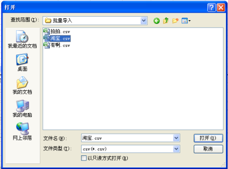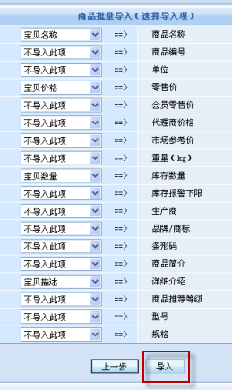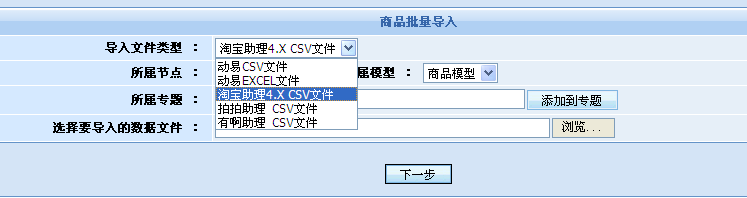 點擊“瀏覽”選擇之前從淘寶導(dǎo)出的CSV文件,可按照系統(tǒng)提示步驟一步一步將從淘寶\拍拍\有啊等平臺導(dǎo)出的商品數(shù)據(jù)導(dǎo)入進來:
