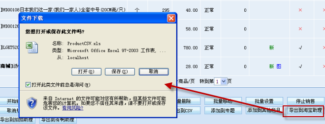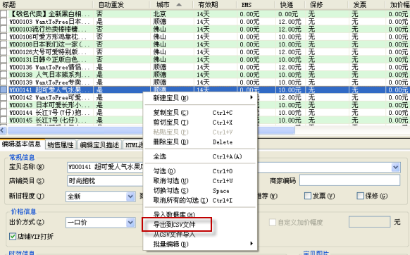 我們先在淘寶助理里把商品數(shù)據(jù)CSV文件導(dǎo)出然后進行保存: