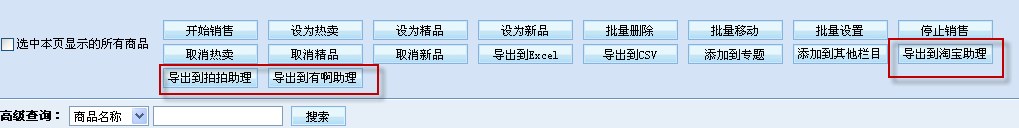 在后臺商品管理列表界面我們可以看到頁面底部多了“導(dǎo)出到淘寶助理”、“導(dǎo)出到拍拍助理”、“導(dǎo)出到有啊助理”三個按鈕,點擊其中任何一個按鈕便可以將全部商品數(shù)據(jù)以CSV文件形式導(dǎo)出至本地保存,然后再在淘寶\拍拍\有啊等平臺助理里導(dǎo)入CSV文件即可將商品數(shù)據(jù)全部導(dǎo)入。