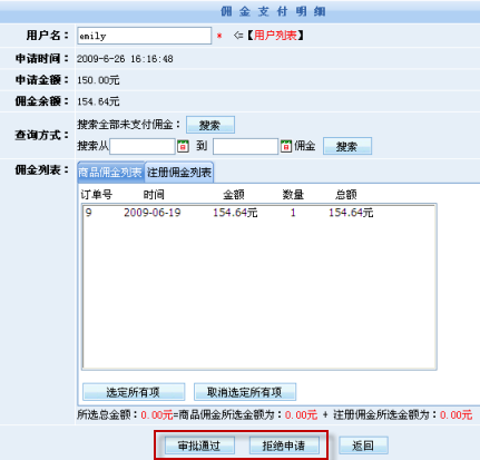 如需對傭金進(jìn)行提現(xiàn),則可以在“提現(xiàn)明細(xì)”里申請?zhí)岈F(xiàn),網(wǎng)店管理員在后臺審批通過后即可將傭金款項(xiàng)打到會員帳戶里。