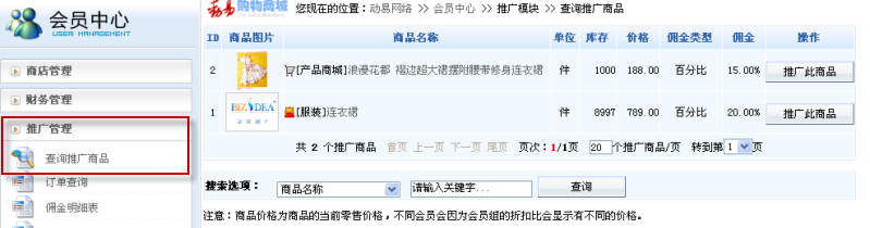 前臺會員可以在會員中心左側(cè)看到“推廣管理”模塊,首先可在“查詢推廣商品”查看到網(wǎng)店的所有推廣商品,如需推廣商品,則直接點(diǎn)擊商品列表后的“推廣此商品按鈕”: