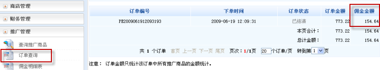 而一旦有人通過推廣鏈接到網(wǎng)店完成下單購買商品并結(jié)清訂單后,系統(tǒng)便將自動給推廣會員發(fā)放傭金: