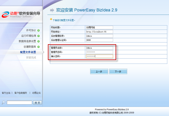 我們看到在頁(yè)面的左側(cè)列出了安裝的所有步驟,以方便用戶查看。此外,還可以在安裝向?qū)О惭b結(jié)束時(shí)直接修改管理員登錄的用戶名、密碼等帳號(hào)信息,也非常便捷:
