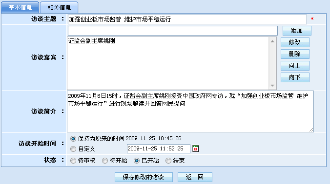 當(dāng)需要?jiǎng)?chuàng)建新一期的在線訪談節(jié)目時(shí),用戶簡(jiǎn)單錄入訪談主題、嘉賓、簡(jiǎn)介、開始時(shí)間、摘要、背景資料等信息后,便可快速創(chuàng)建起新的訪談節(jié)目。
