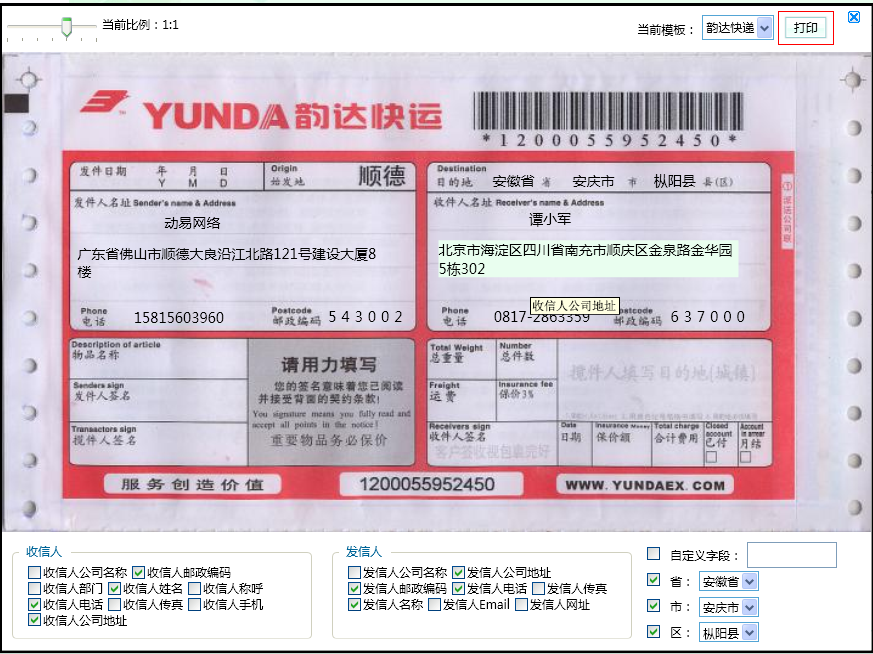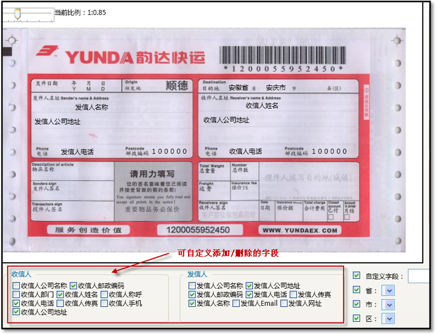 可自行添加各個(gè)不同快遞公司的快遞單模板,并可根據(jù)具體情況對快遞單需打印字段進(jìn)行自定義勾選添加或刪除,如收信人姓名、收信人公司名稱、發(fā)信人地址、發(fā)信人聯(lián)系電話等等。