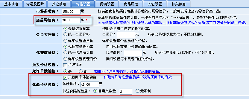 利用商品體驗(yàn)價(jià)功能,商家可以開(kāi)展對(duì)新產(chǎn)品的上市推廣工作。新產(chǎn)品上市之初,由于顧客對(duì)其不了解,自然不會(huì)輕易產(chǎn)生購(gòu)買(mǎi)欲望,這時(shí)候,商家如果以一個(gè)較低的價(jià)格來(lái)推廣新產(chǎn)品,勢(shì)必會(huì)引起新老顧客對(duì)新產(chǎn)品的體驗(yàn)興趣、從而主動(dòng)下單購(gòu)買(mǎi)新產(chǎn)品。