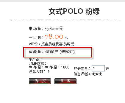 設(shè)置好后,我們便可以在前臺(tái)商品信息頁(yè)面查看到該商品的體驗(yàn)價(jià)和限購(gòu)數(shù)量: